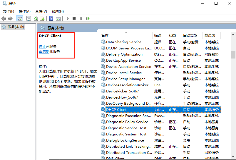 在开始菜单搜索 “服务” 窗口打开。找到 DHCP Client 并重新启动,同时设置为自动,查看是否解决问题