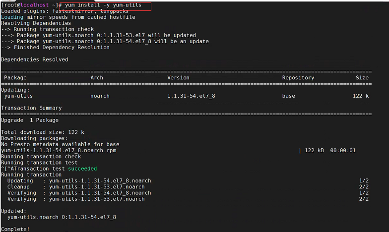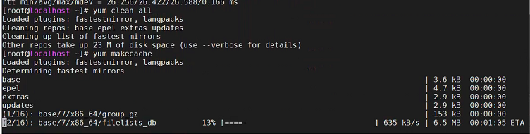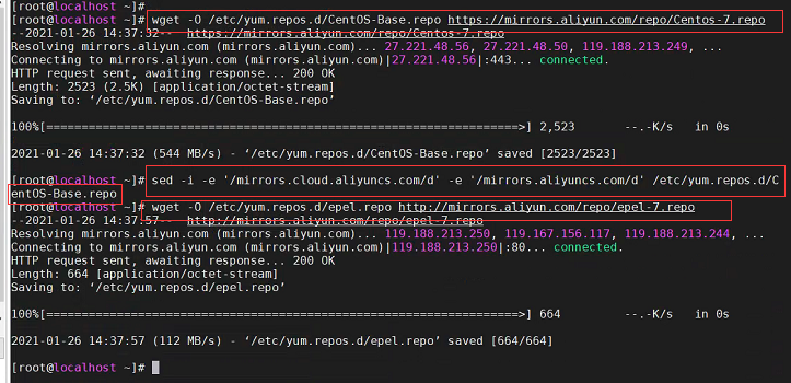 [root@localhost /]# wget -O /etc/yum.repos.d/CentOS-Base.repo https://mirrors.aliyun.com/repo/Centos-7.repo[root@localhost /]# sed -i -e '/mirrors.cloud.aliyuncs.com/d' -e '/mirrors.aliyuncs.com/d' /etc/yum.repos.d/CentOS-Base.repo[root@localhost /]# wget -O /etc/yum.repos.d/epel.repo http://mirrors.aliyun.com/repo/epel-7.repo[root@localhost ]# yum clean all[root@localhost /]# yum makecache