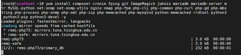 [root@localhost ]# yum install -y yum-utils[root@localhost /]# yum localinstall http://rpms.remirepo.net/enterprise/remi-release-7.rpm -y[root@localhost /]# yum-config-manager --enable remi-php73[root@localhost /]# yum install composer cronie fping git ImageMagick jwhois mariadb mariadb-server mtr MySQL-python net-snmp net-snmp-utils nginx nmap php-fpm php-cli php-common php-curl php-gd php-mbstring php-process php-snmp php-xml php-zip php-memcached php-mysqlnd python-memcached rrdtool python3 python3-pip python3-devel -y[root@localhost /]# yum install -y zip unzip