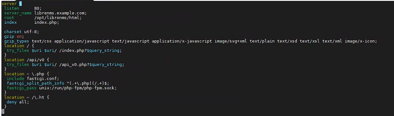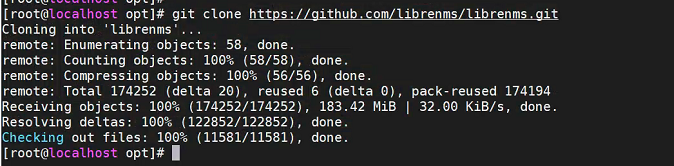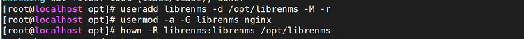 [root@localhost /]# cd /opt/[root@localhost /]# git clone https://github.com/librenms/librenms.git[root@localhost /]# useradd librenms -d /opt/librenms -M -r[root@localhost /]# usermod -a -G librenms nginx[root@localhost /]# chown -R librenms:librenms /opt/librenms[root@localhost /]# chmod 770 /opt/librenms[root@localhost /]# chgrp apache /var/lib/php/session/