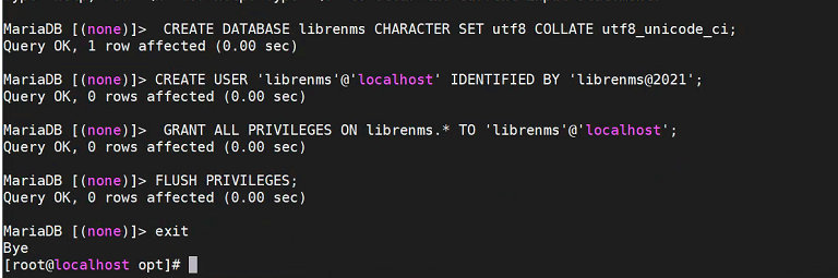 [root@localhost opt]# systemctl start mariadb[root@localhost opt]# mysqladmin -u root password 'MySQL@2021'[root@localhost opt]# mysql -u root -pMySQL@2021MariaDB [(none)]> CREATE DATABASE librenms CHARACTER SET utf8 COLLATE utf8_unicode_ci;MariaDB [(none)]> CREATE USER 'librenms'@'localhost' IDENTIFIED BY 'librenms@2021';MariaDB [(none)]> GRANT ALL PRIVILEGES ON librenms.* TO 'librenms'@'localhost';MariaDB [(none)]> FLUSH PRIVILEGES;MariaDB [(none)]> exit[root@localhost /]# vim /etc/my.cnf[mysqld]下加入如下两行datadir=/var/lib/mysqlsocket=/var/lib/mysql/mysql.sock[root@localhost /]# systemctl enable mariadb[root@localhost /]# systemctl restart mariadb