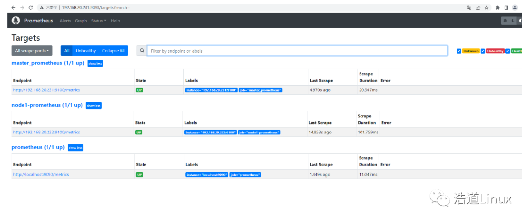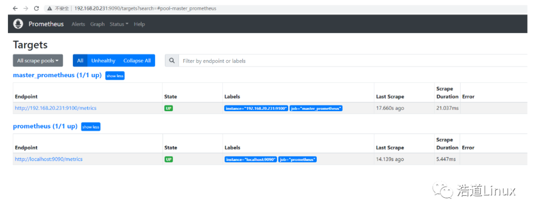 - job_name: 'master_prometheus'static_configs:- targets: ['192.168.20.231:9100']