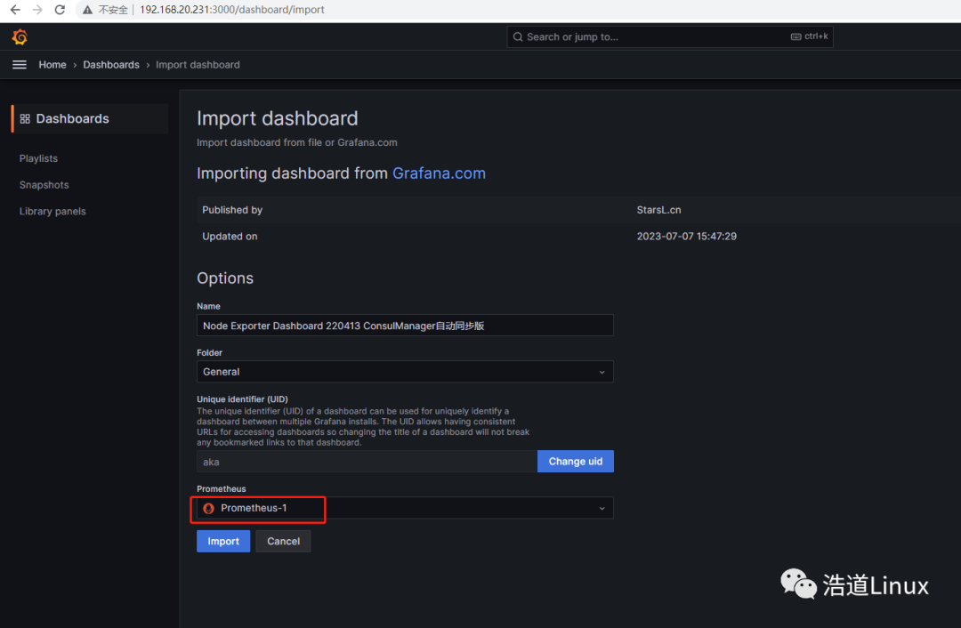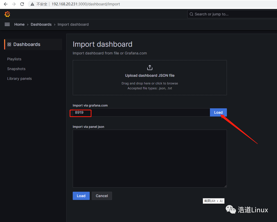 3)点Load后,稍等会,grafana会直接从官方网站导入编号为8919的面板如下图所示: