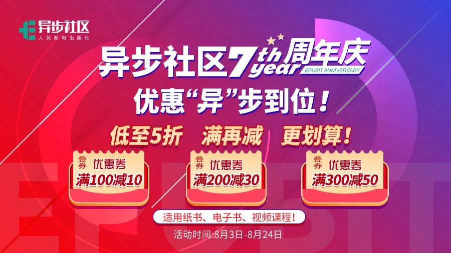 趁着异步社区7周年,给粉丝朋友们带来一波福利!全场5折(纸书、电子书、在线专栏和视频课程),同时,再送可叠加优惠券,放“价”更狠!100-10,200-30,300-50,优惠“异”步到位!最低可至4.1折!
