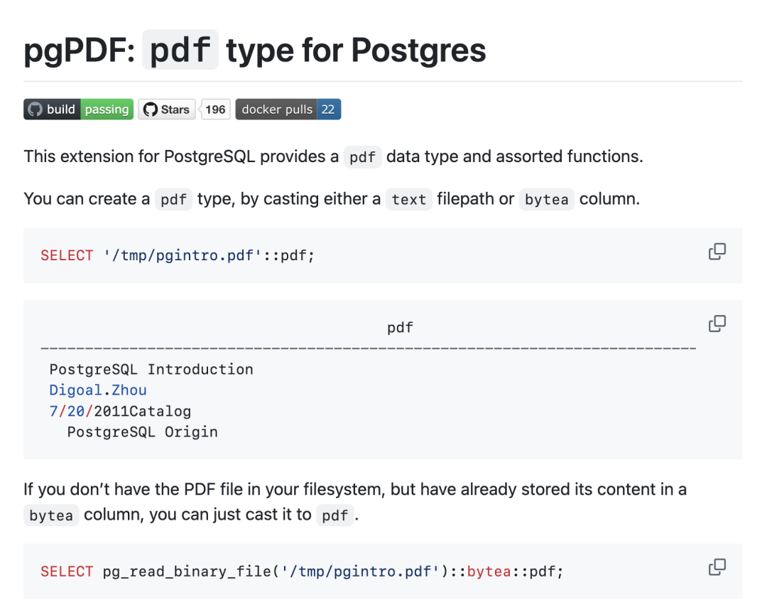 不过,检索 PDF 算是个麻烦事儿。而得益于 PostgreSQL 强大的可扩展性,pgpdf 扩展可以帮你做到这一点:它提供了一种新的 PDF 数据类型,并允许用户在数据库中直接使用 SQL 读取 PDF,解析内容并提取文本。