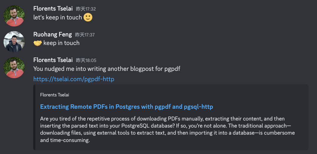 受到聊天的推动,Flo 写了一篇博客 (https://tselai.com/pgpdf-http),演示了如何组合使用 PGPDF 和 PGSQL-HTTP 扩展在 Postgres 中远程提取 PDF,以下是博客翻译: