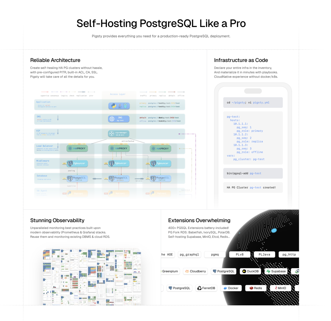Pigsty 扩展仓库提供了 PostgreSQL 生态中无可比拟的 400 个扩展插件,并在十个主流 Linux 发行版大版本上提供开箱即用 DEB/RPM 包。我会专门开一个全新专栏,详细介绍这些扩展插件。