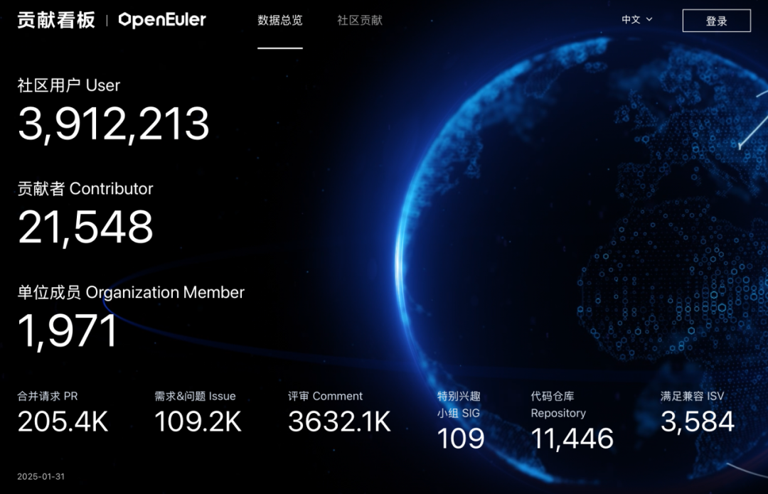 截至2025年1月31日,openEuler 社区用户累计超过391万。超过2.1万名开发者在社区持续贡献。社区累计产生 205.4K个PRs、109.2K条Issues。目前,加入openEuler社区的单位成员1971家,1月新增34家。