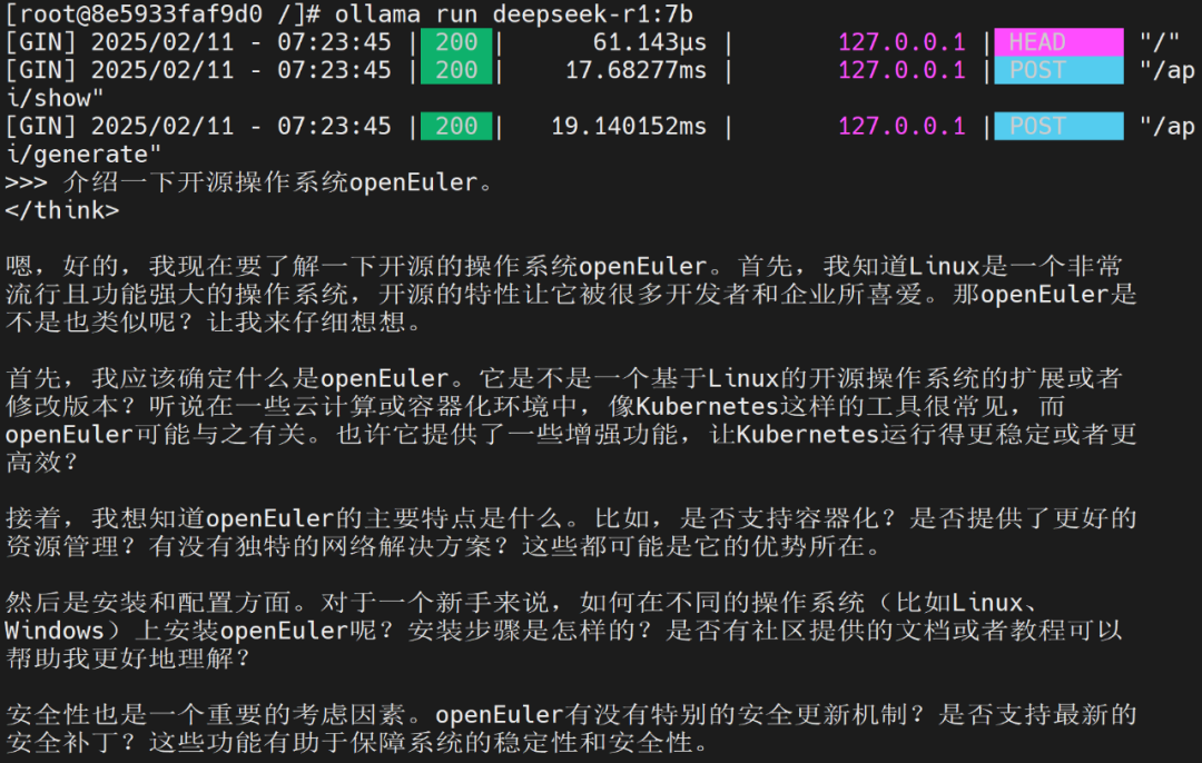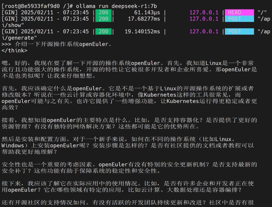 以下部署流程是在 openEuler 24.03 LTS 版本上使用 Ollama 推理框架部署 DeepSeek-R1-Distill-Qwen-7B 的流程。注意:该方式可能会存在下载速度缓慢的问题,后面提供了手动下载部署安装的方式,便于在网络环境不好的情况下进行部署安装。