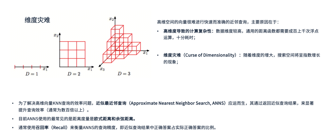 之所以在向量检索中进行 Top N 查询显得如此复杂,主要原因在于向量本身的维度通常非常高。这导致了计算的复杂性,每次计算都需要进行数百到数千次的浮点运算。此外,随着维度的增加,搜索空间呈指数级增长,出现了所谓的“维度灾难”。因此,传统的 Top N 查询方法无法满足这一业务需求。尤其是在大模型应用中,例如 RAG(Retriever-Augmented Generation),它对向量检索的响应时间要求通常在毫秒级。因此,传统的暴力检索方法或简单的 Top N 查询无法满足这样的性能要求。