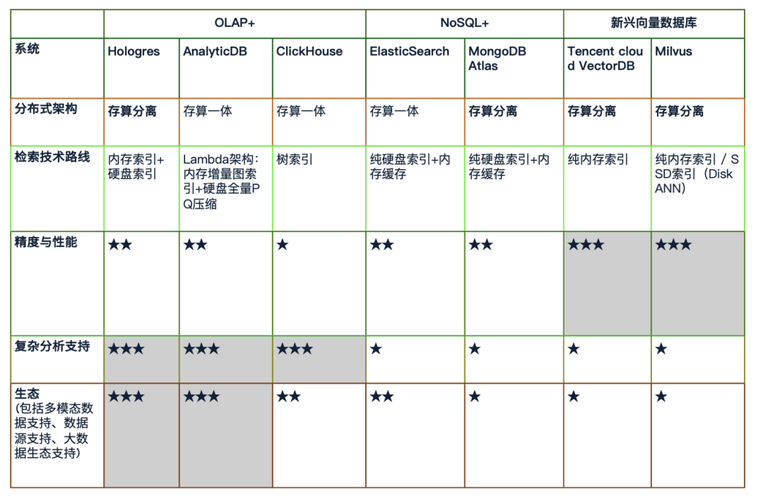 此外,NoSQL 数据库领域,Elasticsearch 由于其基于倒排索引和文本检索的强大生态系统,广泛应用于各种场景。而在 OLAP 领域,Hologres 和 ClickHouse 也有向量检索的相关扩展。