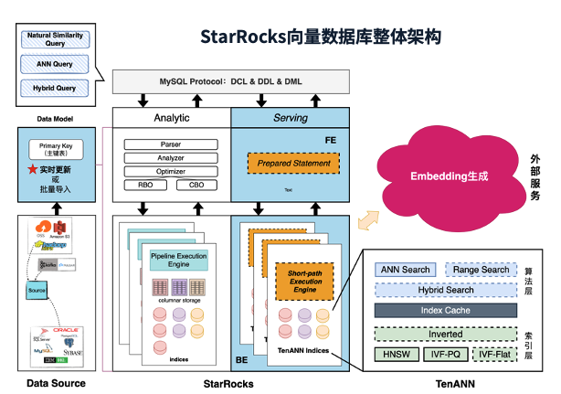 我们内部的实现架构是基于服务分析一体化的向量数据库雏形。StarRocks 本身是 MPP 架构,适用于 OLAP 分析,但不适合高 QPS 的实时查询。因此,我们在 StarRocks 上拓展了服务架构,以支持高并发的专有向量查询服务。