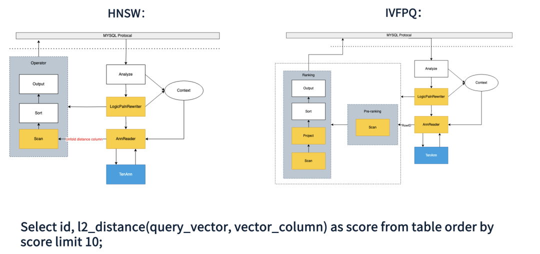 我们的方法本质上很简单。首先,在匹配向量检索时,我们会直接调整逻辑计划,将能下推到向量索引的所有条件都下推到底层执行。这样,我们可以通过上下文条件获得对应的距离信息,并将该距离从行转列,物化成一个新的列。接着,我们会将排序字段替换为计算出的向量距离,从而实现向量检索的查询过程。