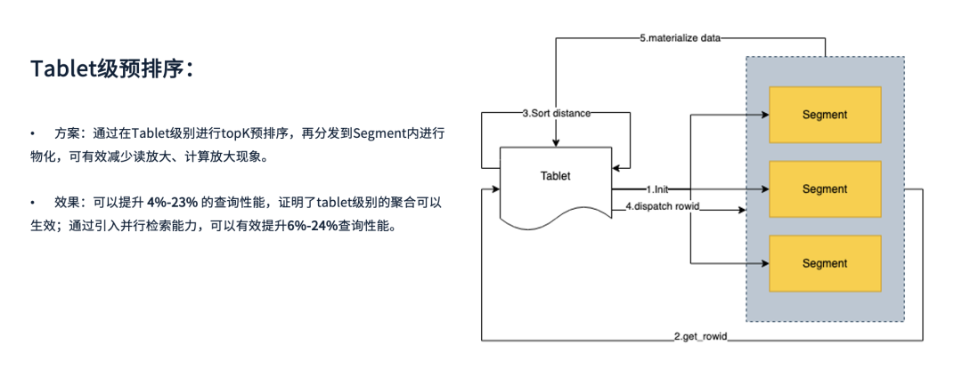 为了优化这一过程,我们采用了 tablet 级别的预排序。具体来说,在每个 segment 进行初始化时,我们会先从向量索引中获取 Top N 的 row ID,并在 tablet 级别进行预排序。这意味着在分发数据并进行物化处理之前,我们已经对数据进行了排序。