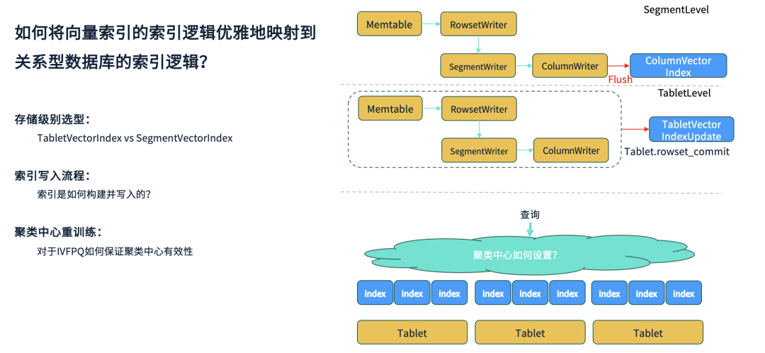 我们最终选择了 segment 级别 的索引的一个关键因素在于索引重建的代价。在业内,当前的大多数向量索引并没有增量索引的功能。例如,Milvus 最近在尝试图形增量索引,但整体而言,增量索引还没有得到广泛实现。如果我们选择 tablet 级别的索引,重建索引的代价将非常高,因为没有增量更新的机制。