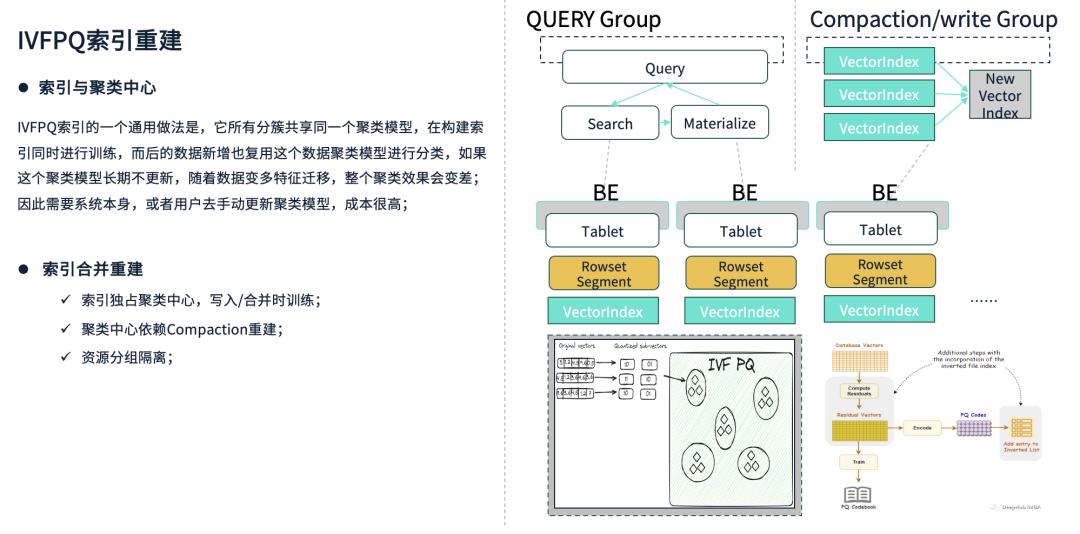 以 IVFPQ 为例,它使用聚类的方法进行索引。IVFPQ 在数据写入时,会通过聚类模型对数据进行剪枝。由于数据是动态变化的,随着数据的不断写入,聚类效果会逐渐变差。特别是当数据中存在“脏数据”时,聚类模型的效果会变得更差。因此,我们的策略是在每次 Compaction 时主动触发索引重建,以确保聚类模型保持最新和有效。