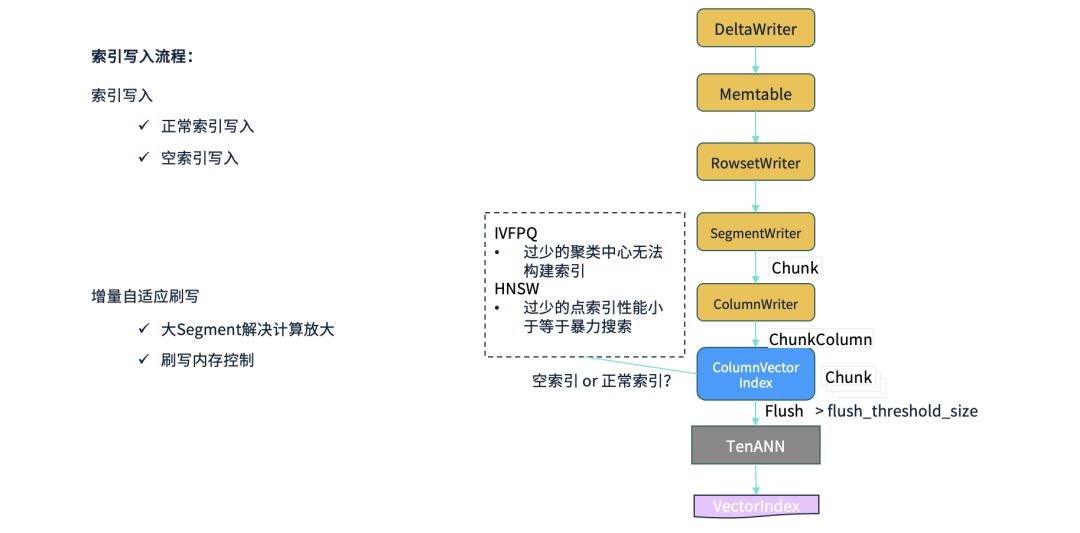 为了解决小数据量聚类的问题,当数据量小到一定阈值时,我们选择写入空索引,并在查询时联动处理。当遇到空索引时,采用暴力计算函数对该 segment 的结果进行计算,最后通过整体排序生成最终的 Top N 结果。这样的处理方式既避免了 badcase 的出现,也实现了性能的提升。