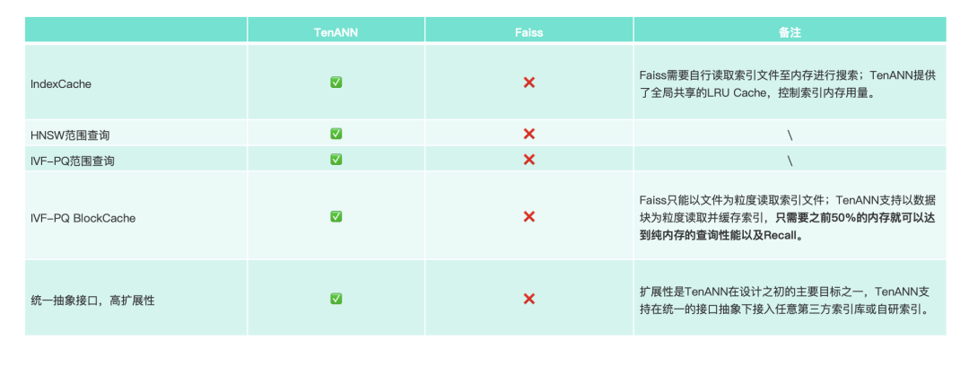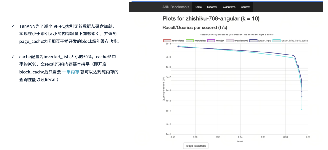 特别是在缓存优化方面,针对 IVFPQ 文件级别读取所带来的内存浪费和缓存效率问题,我们开发了基于 block 的内存缓存机制。通过这一优化,只需原内存的一半(50%),就能达到纯内存查询时的性能和召回率。同时,我们为外部引擎提供了统一的接口,大大提升了使用的便捷性。