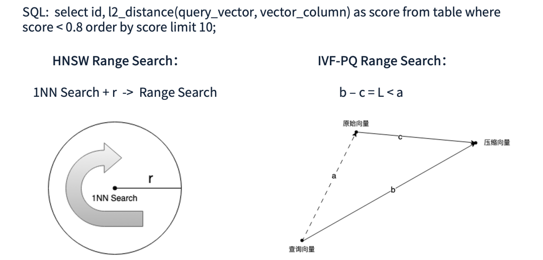 对于 IVFPQ,我们使用了一个巧妙的小技巧——三角不等式。由于 IVFPQ 是基于向量压缩的算法,查询向量和压缩向量的距离(记为 b)可以在 IVFPQ 算法中直接得到。而压缩向量与原始向量的距离(记为 c)是已有的映射关系。因此,可以计算出 l = b - c。根据三角不等式,l 必然小于查询向量和原始向量的距离 a。如果 r 小于 a,则可以判定查询向量和原始向量的距离一定大于 r,进而过滤掉不符合条件的数据点。