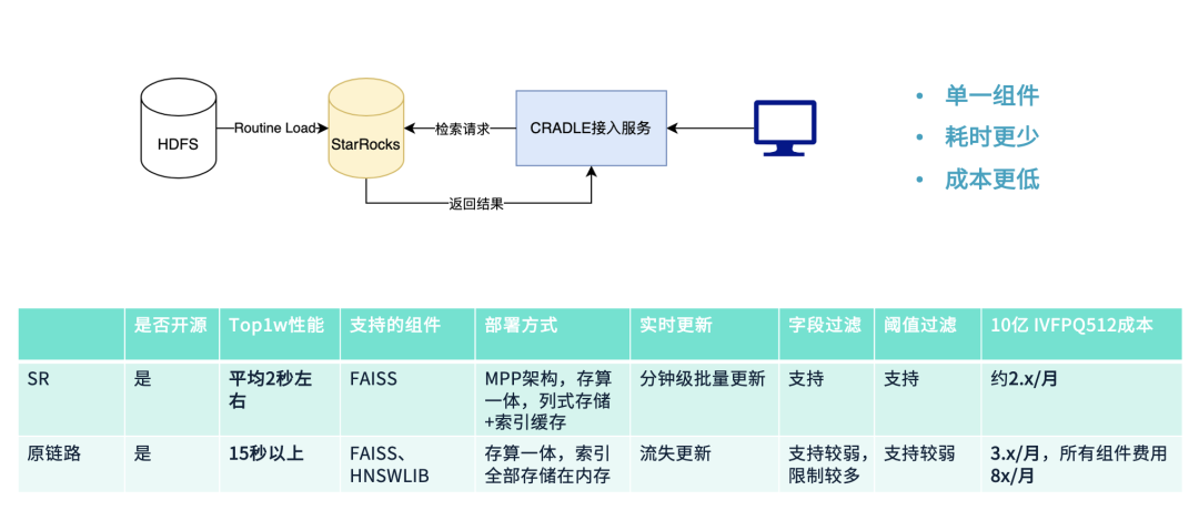 我们团队的整体策略是这样的:尽管在性能上,我们可能没有像 Milvus 那样经过多年深耕,做到极致优化,但我们的优势在于成本更低,且能够处理更大的数据量。对于生态较为成熟的 Elasticsearch,尽管它的性能优越,但在某些场景下,我们的性能表现更好。因此,我们选择在这一“夹缝”中寻求生存,提出了一个经济适用型的 StarRocks 向量索引扩展方案。