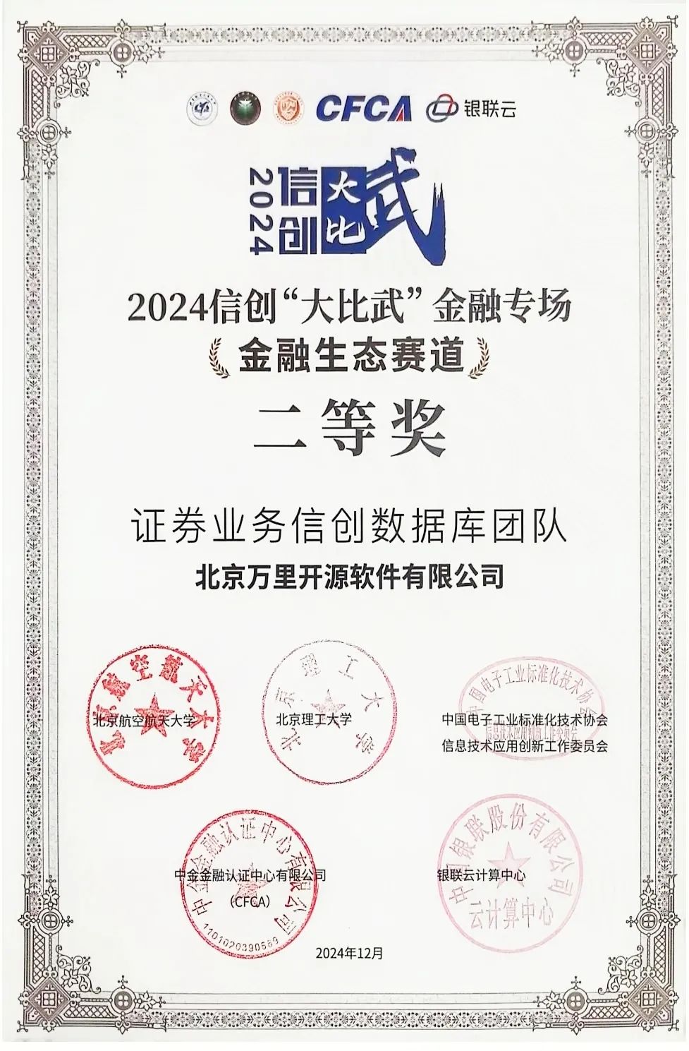 万里数据库证券业务信创数据库团队提交的《证券行业核心交易系统信创数据库改造项目》,在上百家参赛单位中脱颖而出,荣获“金融生态”赛道二等奖,再次彰显了公司在金融信创领域的技术实力和市场竞争力。