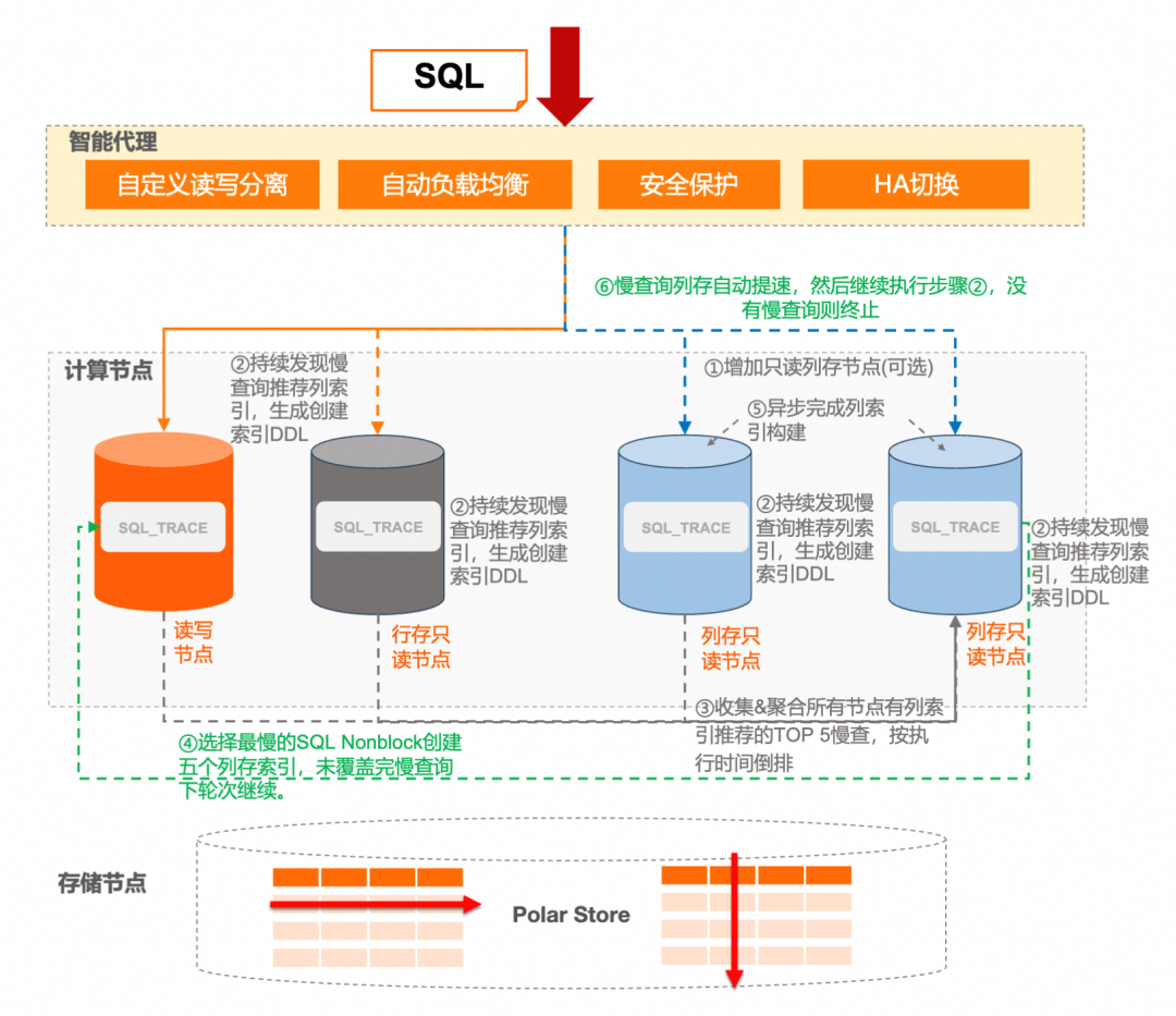PolarDB MySQL 版集群各节点使用 SQL Trace 功能采集慢查询,对符合条件的 SQL 自动生成创建列索引的 DDL 语句。具体流程如下: