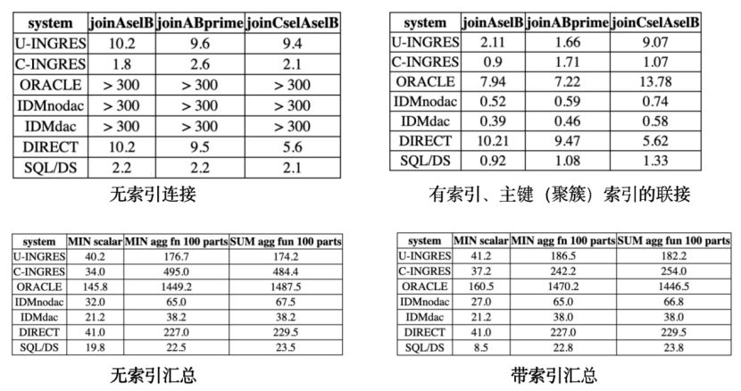德威特随基准还公布了针对几个数据库的评测结果,其中包括大学版INGRES(U-INGRES)、商业版INGRES(C-INGRES)、Oracle、SQL/DS等产品。下图展示了最初公布的一组测试结果: