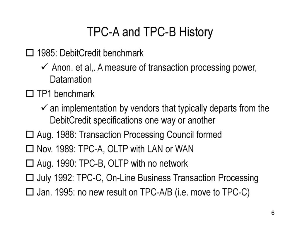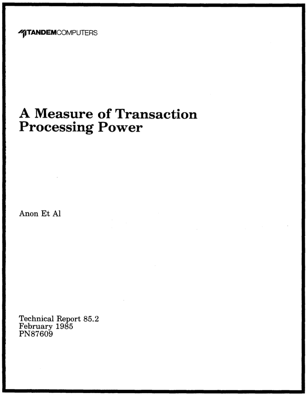 1984年,在天腾计算机(Tandem Computers)工作期间,吉姆·格雷撰写了 "交易处理能力的衡量标准",并将其分发给一批工业界和学术界的专业人士,征求他们的意见。在收到评论后,他慷慨地将工作归功于所有向他发送评论的人,并在1985年4月1日在名为Datamation的杂志上发表。这篇论文是1988年交易处理性能委员会(Transaction Processing Performance Council,TPC)成立的动因。