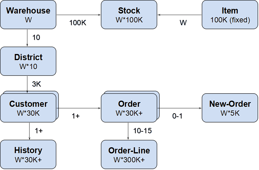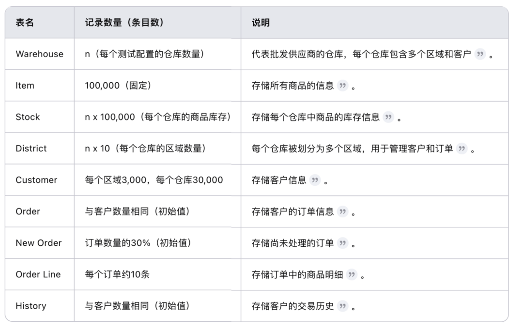 TPC-C是一个OLTP基准,以数据库每分钟处理的事务数 (tpmC) 作为主要的测试结果,可以用于评估数据库系统的性能,并与其他系统进行比较。通常,TPM(Transactions Per Minute)值越高,表示数据库系统处理事务的能力越强。TPC-C通过9个数据表,模拟一个复杂的批发供应商业务场景,涵盖了多种事务类型和数据模型,能够全面评估OLTP系统的性能。