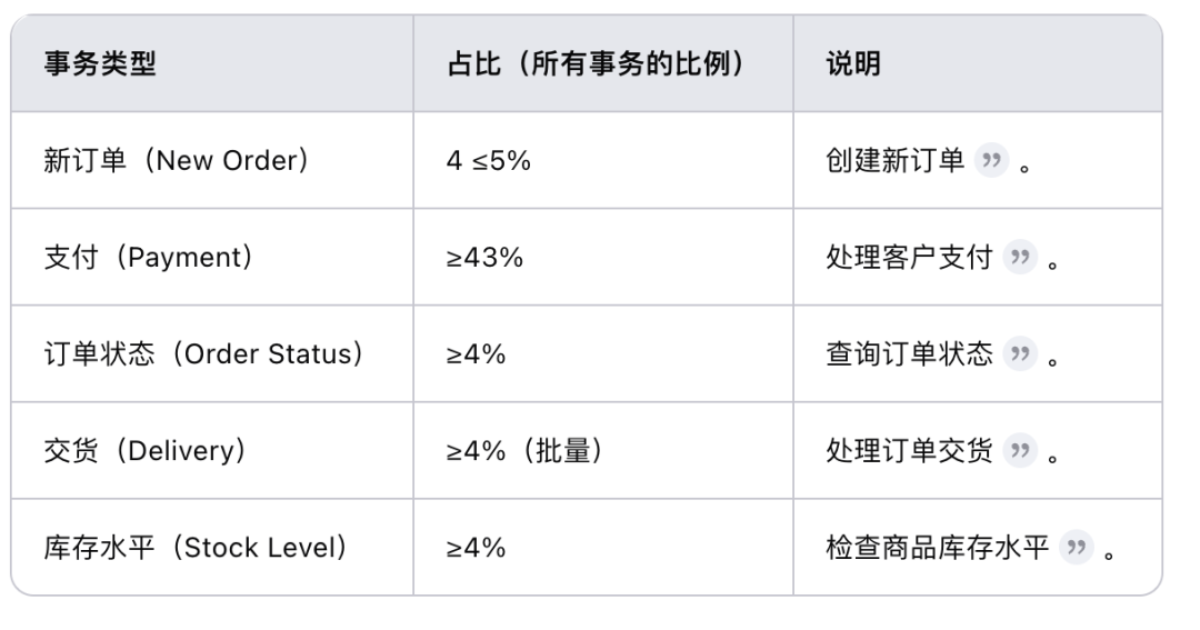 TPC-C测试包含五种不同类型的事务,这些事务以不同的比例并发执行。TPC-C的性能指标是tpm-C,即每分钟处理的新订单事务数量。这个指标综合反映了系统的业务吞吐能力。