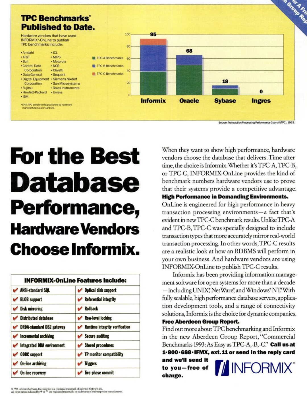 TPC-C基准公布之后,在很长一段时间内,成为了各厂家争夺的焦点。在上世纪90年代,Oracle和Informix之间展开了火药味十足的争斗。Informix经常在报刊上刊登整版的广告,宣传其发布了领先的测评记录。下图是1993年Informix的广告。Informix-OnLine数据库一度称为了Oracle的强劲对手。