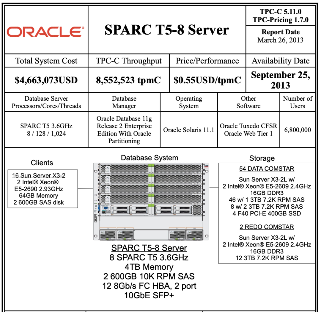 Oracle在TPC-C榜单上的最后提交记录是在2013年,当时Oracle使用一台SUN的服务器 T5-8 的8路服务器,实现了855万的tpmC成绩。每tpmC成本为0.55美元。这在当时是相当出色的表现。现在也在性能榜单上名列第7名。