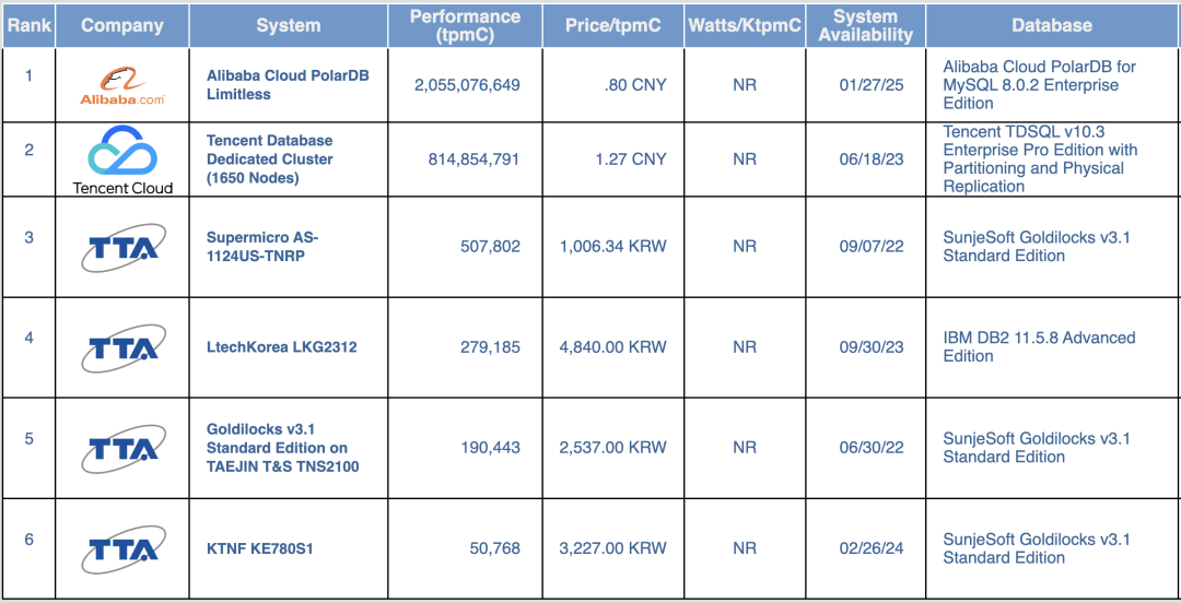 时至今日,在全球数据库市场上,传统关系型数据库已经成熟,所以北美的产品基本上不再打榜,也没有有效活跃的纪录了。目前主要是中国(阿里云、腾讯云)、韩国(SunjeSoft)等新兴市场的数据库产品在进行TPC-C的评测。下图是当下TPC-C榜单上的有效纪录。