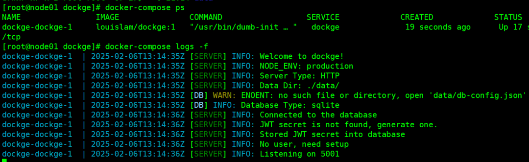 Dockge 启动完成之后检查服务状态和日志: