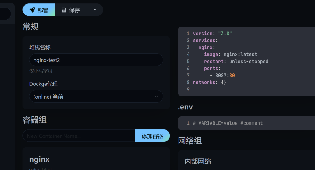 4、我们可以编辑docker compose服务名称,容器镜像,端口,卷挂载,网络等信息,会自动生成compose文件,并且可以直接保存之后启动服务。
