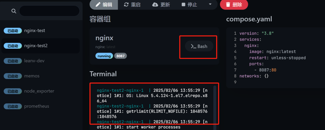 6、Dockge启动之后,我们可以查看docker compose服务输出的终端日志。