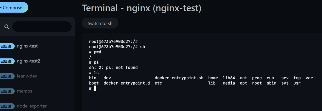 7、Dockge支持在web终端直接进入compose服务的容器内部terminal.