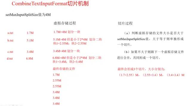 例如setMaxInputSplitSize值为4M,输入文件大小为8.02M,则先逻辑上分成一个4M。剩余的大小为4.02M,如果按照4M逻辑划分,就会出现0.02M的小的虚拟存储文件,所以将剩余的4.02M文件切分成(2.01M和2.01M)两个文件。