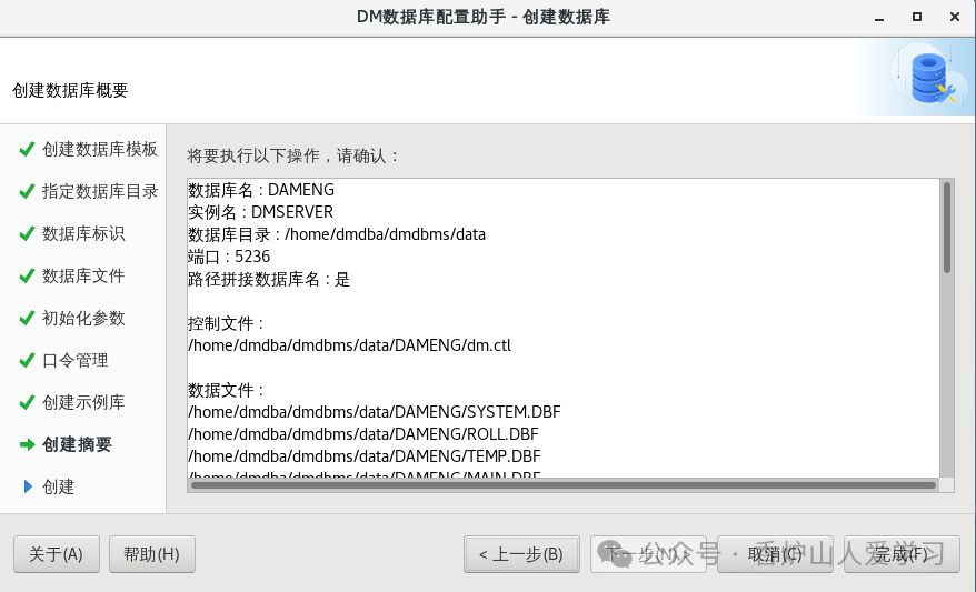 [root@localhost DAMENG]# ls bak ctl_bak DAMENG02.log DMHR.DBF dminit20250116164237.log HMAIN ROLL.DBF SYSTEM.DBF trace BOOKSHOP.DBF DAMENG01.log dm.ctl dm.ini dm_service.prikey MAIN.DBF sqllog.ini TEMP.DBF每创建一个 DM 数据库,就会自动生成 dm.ini 参数文件。dm.ini 是 DM 数据库启动所必须的配置文件,通过配置该文件可以设置 DM 数据库服务器的各种功能和性能选项,主要的配置模块包括:控制文件相关、实例名、内存相关、线程相关等。