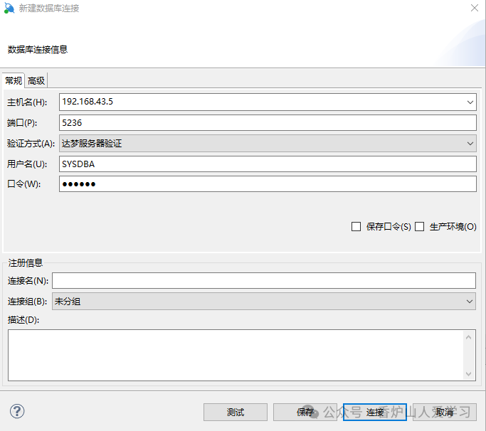 [dmdba@localhost bin]$ ./disql SYSDBA/SYSDBA@192.168.43.5:5236服务器[192.168.43.5:5236]:处于普通打开状态 登录使用时间 : 4.192(ms) disql V8 SQL>