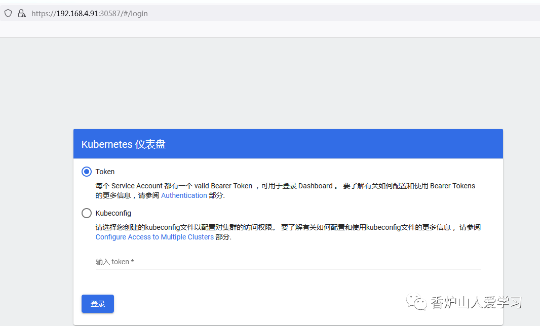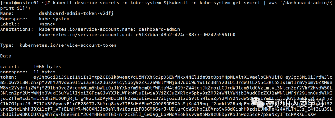 [root@master01 ~]# kubectl describe secrets -n kube-system $(kubectl -n kube-system get secret | awk '/dashboard-admin/{print $1}')