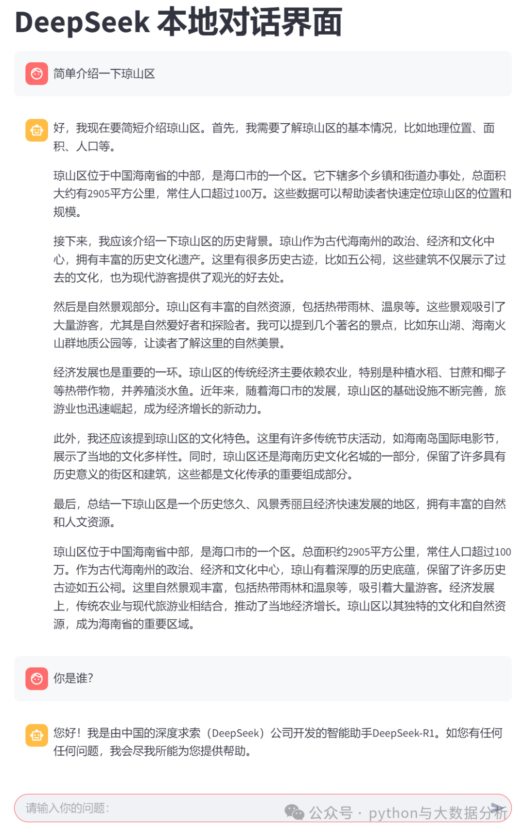 import streamlit as stimport requestsimport json# 设置本地DeepSeek API的URLDEEPSEEK_API_URL = "http://localhost:12345/api/generate"headers = {"Content-Type": "application/json"}streamflag=False# 设置Streamlit页面标题st.title("DeepSeek 本地对话界面")# 初始化会话状态if "messages" not in st.session_state:st.session_state.messages = []# 显示历史消息for message in st.session_state.messages:with st.chat_message(message["role"]):st.markdown(message["content"])# 用户输入if prompt := st.chat_input("请输入你的问题:"):# 添加用户消息到会话状态st.session_state.messages.append({"role": "user", "content": prompt})with st.chat_message("user"):st.markdown(prompt)# 定义请求的数据data = {"model": "deepseek-r1:14b", # 替换为你的本地模型名称"prompt": prompt,"stream": True # 启用流式响应为True,不启用为False}contentjson = json.dumps(data)# ---------------------------------------非流式响应的代码----------------------------------------------# try:# response = requests.post(DEEPSEEK_API_URL, headers=headers, data=contentjson)# response.raise_for_status() # 检查响应状态码# result = response.json()# returntxt=result['response']# returntxt=returntxt.replace('<think>\n\n</think>\n\n','').replace('<think>','').replace('</think>','')# st.markdown(returntxt)# except Exception as e:# st.error(f"调用API时出错:{str(e)}")# ---------------------------------------流式响应的代码----------------------------------------------# 发送请求并处理流式响应with st.chat_message("assistant"):response_placeholder = st.empty() # 创建一个占位符用于流式更新full_response = ""try:# 发送POST请求with requests.post(DEEPSEEK_API_URL, headers=headers, data=contentjson, stream=True) as response:if response.status_code == 200:# 逐行读取流式响应for line in response.iter_lines():if line:# 解析JSON数据decoded_line = line.decode("utf-8") # 转码chunk = json.loads(decoded_line) # 将字符串类型的字典转为真正的字典类型# 解析返回内容# 判断是否有返回内容if 'response' in chunk:piece = chunk['response'] # 获取返回内容piece=piece.replace('<think>\n\n</think>\n\n','').replace('<think>','').replace('</think>','') # 对一些符号进行额外处理if piece !='':full_response += pieceresponse_placeholder.markdown(full_response) # 更新占位符内容else:st.error(f"API调用失败,状态码:{response.status_code}")except Exception as e:st.error(f"调用API时出错:{str(e)}")# 将助手回复添加到会话状态st.session_state.messages.append({"role": "assistant", "content": full_response})