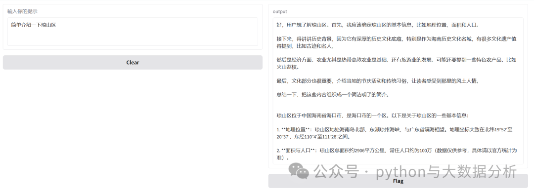 import gradio as grimport json,requestsDEEPSEEK_API_URL = "http://localhost:12345/api/generate"headers = {"Content-Type": "application/json"}streamflag=Falsedef generate_response(prompt):"""通过Ollama API生成响应"""content = {"model": "deepseek-r1:14b", # 模型名称"prompt": prompt, # 输入的提示信息"stream": True # 是否使用流式响应}contentjson = json.dumps(content)response = requests.post(DEEPSEEK_API_URL, headers=headers, data=contentjson, stream=True)response.raise_for_status()generated_text = ""for line in response.iter_lines():if line:decoded_line = line.decode('utf-8')chunk = json.loads(decoded_line)if 'response' in chunk:piece = chunk['response'] # 获取返回内容piece = piece.replace('<think>\n\n</think>\n\n', '').replace('<think>', '').replace('</think>','') # 对一些符号进行额外处理if piece != '':generated_text += piecereturn generated_text.strip() # 返回最终的文本,去除最后的换行符# 创建Gradio界面iface = gr.Interface(fn=generate_response, inputs=gr.components.Textbox(lines=3, label="输入你的提示"), outputs="text",live=True)iface.launch()