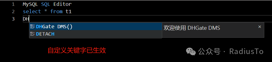 测试 SQL 代码补全功能,可见我们常用的 SQL 语法关键字已能够自动提示。