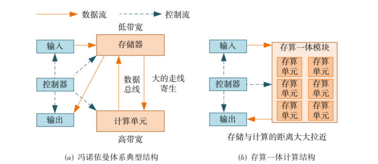 在冯·诺依曼架构中,存储模块是为计算服务的,因此设计上会考虑存储与计算的分离与优先级。具体来讲,数据从存储单元外的存储器获取,处理完毕后再写回存储器,计算核心与存储器之间有限的总带宽直接限制了交换数据的速度,计算核心处理速度和访问存储器速度的差异进一步减缓处理速度。