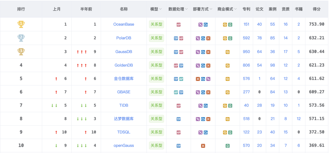 OceanBase本月得分突破700大关,并迎来了在技术创新与人才培养双轮驱动。OceanBase数据库大赛近日落幕,大赛已连续举办四届,不仅为业内挖掘了大量优秀的技术人才,也加深了开发者与OceanBase产品的互动。在技术创新方面,面向 AP 场景的长期支持版本 4.3.5 LTS将于一季度内上线 OB Cloud,此外,云上高可用性能再升级,OB Cloud 实现跨云双活和主备能力。随着这些技术创新的不断落地,OceanBase的未来的表现值得我们更加期待。 PolarDB本月得分632.21,稳居排行榜第二位。1月,国际市场研究机构Gartner®发布了2024年度全球《云数据库管理系统魔力象限》报告,阿里云作为亚太区唯一入选“领导者(LEADERS)”象限的科技公司,连续五年位居该象限,进一步证明了PolarDB在技术实力和市场影响力上的国际认可。 GaussDB本月得分630.44稳坐前三。过去一年,其表现可圈可点:连续9次位居中国本地部署数据库市场第一,并成功入选Gartner“云数据库魔力象限”挑战者象限;在金融级分布式数据库市场,GaussDB市场份额排名第一;多款产品通过国内外的安全测评,并获得最高安全等级双认证…2025年,随着技术的进一步发展与创新,GaussDB无疑将在行业中继续发挥重要作用,值得我们期待。 自去年底跻身前五以来,金篆信科GoldenDB一直保持榜单领先地位。随着其在党政、金融、运营商、交通、能源等多行业加速拓展,适配测试需求持续攀升。为满足这一需求,GoldenDB在官网推出版本试用申请功能,为合作伙伴提供便捷的适配测试通道,全程由技术专家提供专业指导。这一举措也彰显了GoldenDB扩大应用范围、拓展市场版图的决心。 金仓数据库本月得分611.62,名次上升一位,近日发布的新版本也带来了技术突破。金仓推出KingbaseES MySQL兼容版V009R003C010和全面兼容SQL Server的版本V009R004C010。这不仅帮助企业平滑迁移到国产数据库,还体现了金仓在性能、高可用性及功能兼容性上的优化。 GBASE得分609.27分,排在第六。除省级框采外,GBASE已成功入围深圳、厦门、大连、宁波等多个城市的数据库框采。GBase在政务信息化领域的应用不断拓展,获得了更多地方政府的认可与信赖。 作为一款领先的分布式SQL数据库,TiDB一直在AI方向上不断努力和创新。近日发布的TiDB 8.5 LTS版本便是其在AI方向上的一个重要里程碑。该版本为企业关键业务带来无与伦比的可扩展性、领先的运维洞察力和 AI 就绪能力,助力企业充分释放“Data+AI ”的生产力。 达梦数据库本月得分571.17。1月6日,达梦公司董事长兼创始人冯裕教授荣获2024年“CCF最高科学技术奖”,以表彰他在计算机领域的卓越贡献。过去一年,达梦围绕“云数智”融合战略,全面升级技术并优化产品。据官方消息,2025年达梦将继续聚焦“云计算与大数据”,依托“产品+数据解决方案”战略,进一步提升其行业竞争力。 在去年底的年终决算夜,60多家银行及大型央企财务公司高效完成决算任务,实现“零失误”,这背后离不开腾讯云数据库TDSQL等“6T”融合创新基础软件的支撑。腾讯云TDSQL本月排名上升一位,得分372.50,这一成绩也展示了其在云数据库领域的持续创新与领先地位。 openGauss在技术突破和社区贡献方面取得了显著成就。近日,openGauss RISC-V SIG成功将openGauss数据库及其组件移植至Fedora,并适配支持RISC-V架构,这展示了其在新兴架构上的适应性和技术前瞻性。此外,1月23日,清华大学李国良教授入选2024年ACM Fellow。作为openGauss社区技术委员会主席,李教授的成就进一步巩固了openGauss在技术创新和社区建设方面的领先地位。