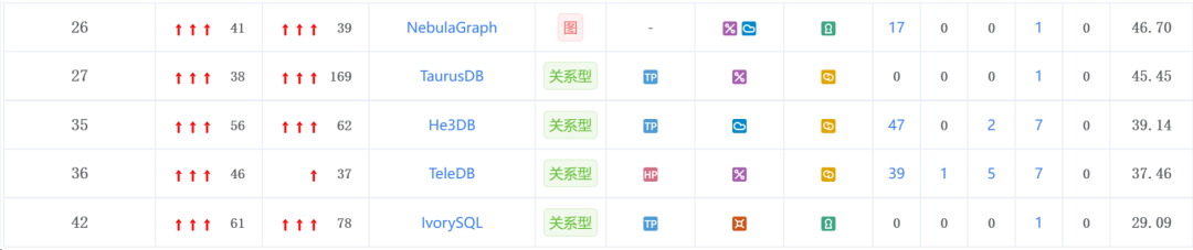 TaurusDB 本月得分 45.45,排名第 27 位。由华为云在 2024 年正式更名,前身为 GaussDB(for MySQL),在品牌重塑后,TaurusDB 的市场定位更加明确。其主要面向企业级 OLTP 应用和高端 MySQL 客户,同时也兼顾中小型企业的需求。 He3DB 是由移动云数据库团队研发的一款计算/存储分离的云原生数据库。它通过计算/存储分离、数据冷热分层和压缩、智能中间件等技术,实现了高性能和低成本的完美结合。He3DB 的设计目标是在保证高性能的同时,最大化地帮助客户节省数据库使用成本。 TeleDB 作为天翼云的数据库产品,覆盖面较广,涵盖集中式、分布式关系型数据库以及 NoSQL 和分析型数据库,并支持公有云、私有云及纯软件部署等多种形态。其灵活的交付方式使其适用于不同类型的企业用户,同时 TeleDB 在技术创新方面也获得了行业认可,成功入选 2024 大数据“星河”案例。 IvorySQL是由是一款完全兼容 Oracle 的 PostgreSQL 数据库,本月排名第42名,其支持 100% 兼容并可直接替换最新 PostgreSQL 版本。IvorySQL 4.2 版本已于 2025 年 1 月 13 日正式发布,全面支持 PostgreSQL 17.2,并修复了多项 bug。作为瀚高股份主导研发的开源数据库,IvorySQL 与 PostgreSQL 国际社区紧密合作,保持核心版本同步更新。