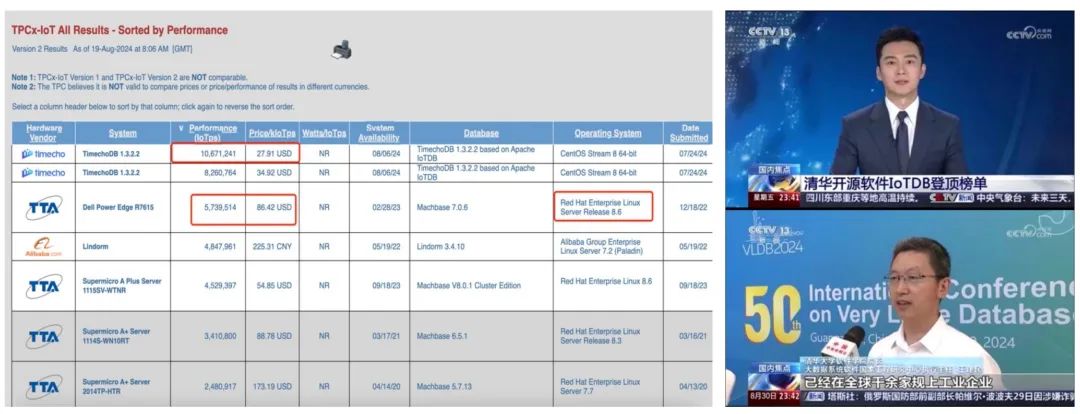 在国际权威数据库性能测评组织 TPC 设立的 TPCx-IoT 性能基准榜单中,天谋科技 IoTDB 以领先第二名 85% 的优势夺得榜首,超越戴尔、超威、韩国 TTA 等国际知名公司,刷新世界纪录,并荣获央视报道。