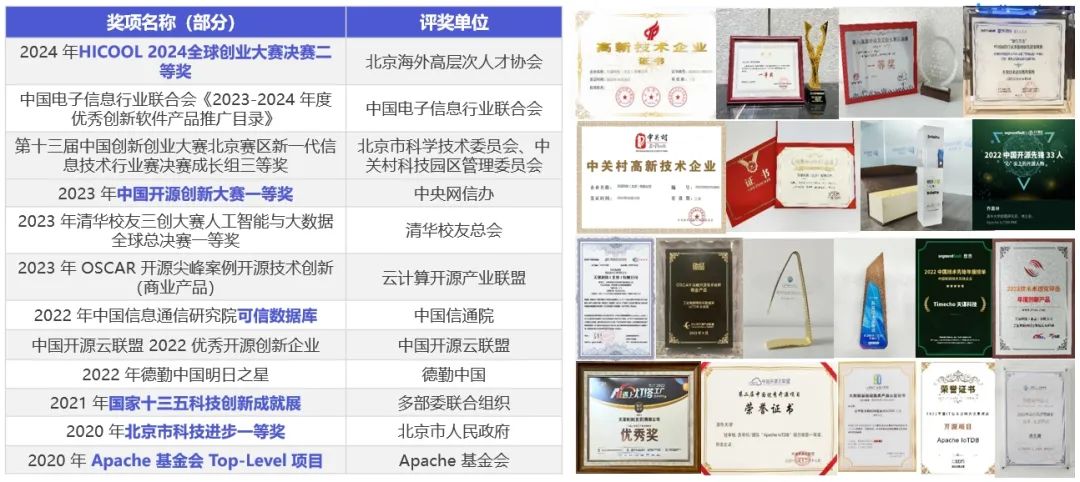 产品层面,物联网原生时序数据库 IoTDB 入选国家“十三五”科技创新成就展,并获得“北京市科技进步一等奖”、“HICOOL 2024 全球创业大赛决赛二等奖”、“中央网信办中国开源创新大赛一等奖”、“中国信息通信研究院可信数据库”等多项技术先锋与开源创新嘉奖。