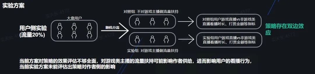 ● 首先,通过随机分流将抖音的大盘用户将分成实验组和对照组,并分别向这两组用户展示不同的版本或者提供不同的策略;● 然后,观察两组用户在抖音的长期留存、观看时长、广告转化率等行为数据;● 最后,通过收集和分析这两组用户的行为数据和反馈,来比较哪种版本或者策略更有效,并最终据此做出产品优化和决策。但该简单实验设计的问题在于:实验所评估得到的策略效果,与该策略实际推全后的真实效果并非一致。在实验中,导致该差异情形的原因众多,本文择取长短期不一致、推荐系统的自我演进、双边效应、网络效应这四种典型原因进行介绍。长短期不一致问题,主要涉及用户的学习效应与指标收敛性两个因素。在持续使用平台的过程中,用户会逐渐猜测推荐内容,并做出相应反馈。例如,在推荐系统向用户推荐更多广告时,用户可能会在短期内点击广告,然而长此以往,猜到推送内容是广告,于是便不再点击。这意味着,如果给用户推更多广告,短期内 GMV 会增长,但从长期看,用户点击量会下降,可能导致最终收入为负向。在当前的互联网行业中,一个实验的观察周期不宜过长。然而,诸多成熟平台却面临着严重的指标收敛性问题:它们在衡量诸如DAU的北极星指标时,往往需要很长时间才能观测出策略对于DAU的影响。以抖音平台的实验为例,很多实验能够在一到两个月之后,观察到DAU的显著收益,并且持续放大不收敛。但是在前期,无法看到这个策略对DAU的置信收益。这说明:实验指标的收敛性问题会导致一些短期实验并不能反映它的长期效果。推荐系统本身存在着自我演进的特殊问题,即随着推荐系统中某一环节发生改变,其他环节也会发生自适应的改变,从而导致实验期间观察到的影响与推全后不同。以消费侧实验为例,如果在推荐系统的粗排环节进行迭代,推荐系统的精排等其他环节,则可能由于流量、时间等原因而并未观察和充分学习到粗排变化对自身的影响。但在实际推全时,随着样本量的提升,系统其他环节将逐渐学习到此效应。实际上,粗排的改变会对召回和精排产生影响,然而在实验期间,这种影响常常难以或无法被充分观测到。 所以推荐系统的自我演进,就有可能致使实验期间的实验读数与正式推全的效果不一致。双边效应是指,当平台上同时存在消费者和生产者两种身份时,用户侧策略可能同时影响生产者的生产意愿,此时消费侧实验的读数,不能全面地反映策略效果。网络效应是一种特殊影响,它指的是,当实验组和对照组的用户存在于同一个社交网络的时候,实验处理可能会通过社交互动影响到对照组的用户。此时,对照组所反映的并非策略未生效时的表现,而是在策略某种非直接影响下的特殊表现。在此种情况下,对照组不能作为真实的对照组,消费侧的 A/B 实验读数也不准确。 举例而言,假设抖音平台想要发展游戏业务,对所有游戏主播进行流量扶持,以期扶持后游戏主播的开播时长能提升,游戏直播的供给能够增长。在此假设情况下,常规的实验方法是开设一个10%或20%的用户侧实验,依然将用户侧分为实验组和对照组,对一组用户进行游戏类目的流量扶持,而对另一组用户不进行流量扶持;然后观察用户在游戏类直播和非游戏类直播中的看播时长、打赏数据,以及留存数据等等。然而,在此情况下观察消费侧实验,只能得到流量扶持在用户侧的直接影响,也就是一阶影响。但在流量扶持后,游戏类主播的供给可能被激发,同时非游戏类直播的开播供给可能受到挤压,而这些发生在作者供给侧的影响,即潜在的二阶影响,则无法被观察到。因此,此时的策略存在双边效应的问题,但实验只能衡量单边效果。在此情况下,可能出现的一个简单解决思路是:直接开设一个作者侧实验,将主播平均分配到实验组与对照组,然后对实验组的游戏主播进行流量扶持,以此评估作者侧的影响。然而,该解决思路并不可行,原因在于其忽视了流量增量的来源。具体而言,假设总共有6名主播,其中2名为游戏主播,4名为非游戏主播。如果对实验组的游戏类主播予以流量扶持,观察在扶持与否的情况下,主播的供给会产生怎样的变化。 那么此时需要考虑的情况就在于:对游戏主播进行流量扶持时,这个额外的流量增量从何而来?● 其一,流量来源于同组非游戏类主播,即被扶持的游戏主播挤压了同组非游戏类主播的流量。这种情况符合预期,同时也是策略推全后,所真实存在的一种流量来源。● 其二,流量来源于也可能来自于对照组主播,由于没有空白的对照组作者承担流量挤压,所以这部分由于流量侵蚀带来的供给提升结果有偏差,推全后流量不存在。举例而言,抖音平台在给某位用户同时推荐10个直播,这意味着前10个主播的排序。此时,如果通过流量扶持,把实验组的游戏主播,从排序的第11位提升到第10位。那么原来的第10位其实是无法控制的,我们无法控制它一定是实验组的作者。也就是他的流量来源可能是对照组作者,但是这个流量在推全之后就不存在了。因为策略实际推全之后将对 100%的作者生效,不存在空白的对照组作者来承担流挤压。因此,由于流量挤压所带来的供给提升,其实就是一个预期之外的有偏结果。综上所述,我们不希望在流量扶持的同时,实验组整体作者去抢对照组整体作者的流量,而只希望流量在实验组内部进行腾挪,这样我们评估的效果与真实推